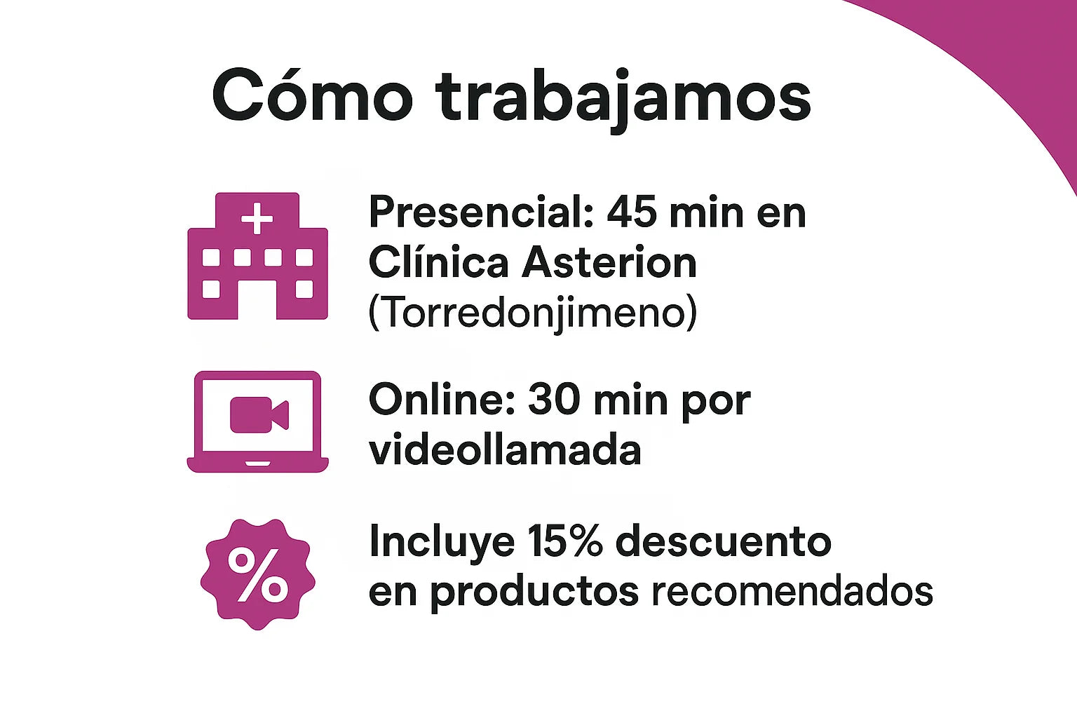 Tras la compra, te contactaremos en horario laboral (lunes a viernes) para acordar tu cita. Puedes elegir entre modalidad presencial u online según tu preferencia.